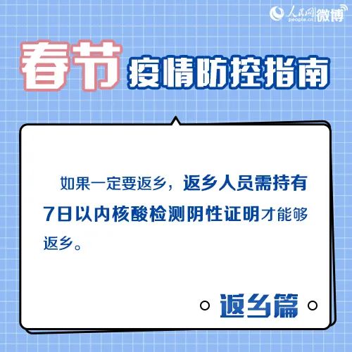 返鄉(xiāng)人員需持7天內(nèi)有效新冠病毒核酸檢測(cè)陰性結(jié)果返鄉(xiāng),返鄉(xiāng)后實(shí)行14天居家健康監(jiān)測(cè),期間不聚集、不流動(dòng),每7天開展一次核酸檢測(cè)?!比涨埃抖杭巨r(nóng)村地區(qū)新冠肺炎疫情防控工作方案》對(duì)農(nóng)村地區(qū)及返鄉(xiāng)人員相關(guān)防疫工作進(jìn)行部署。